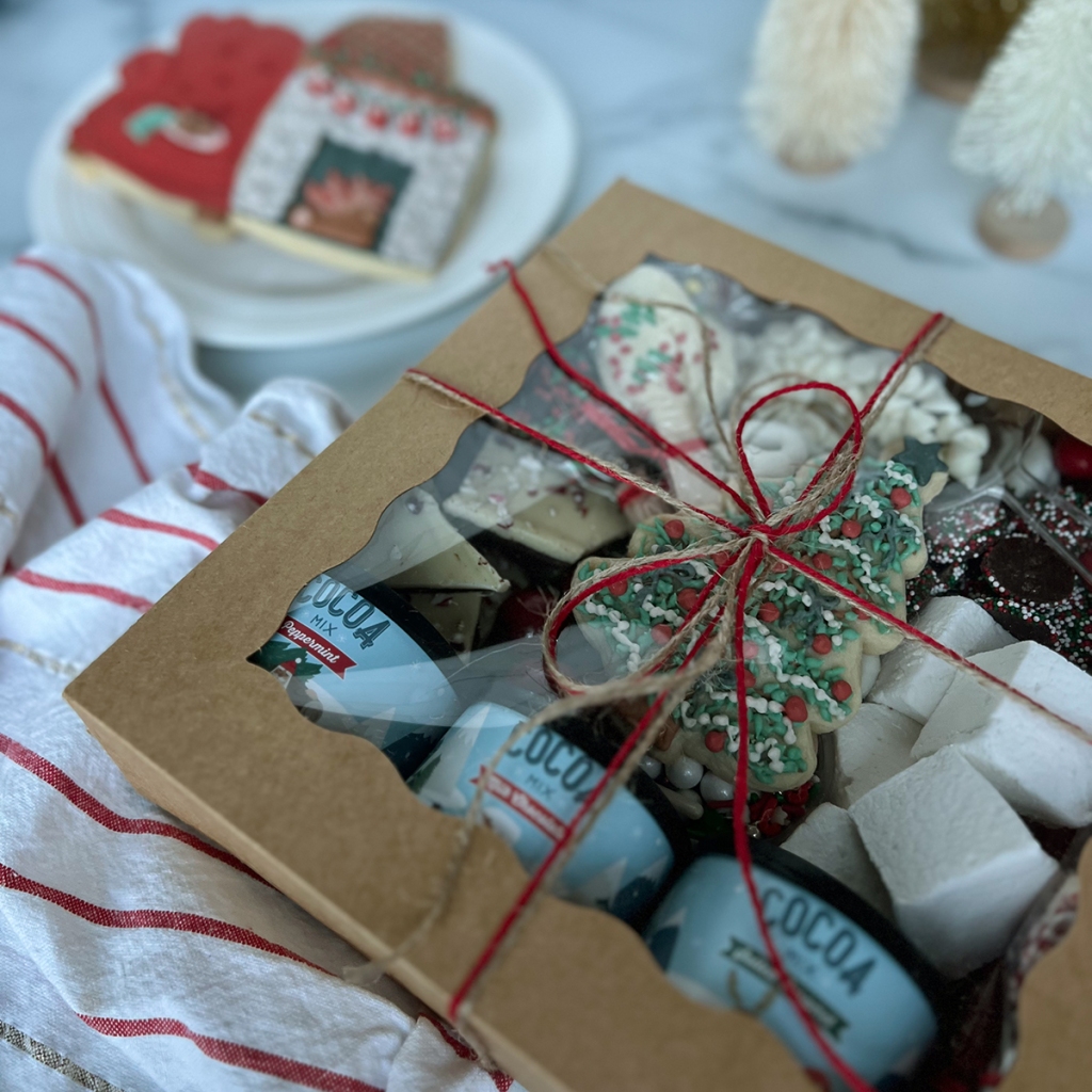 Last year we decided to share that holiday magic and made hot cocoa charcuterie boxes for our friends and delivered them to their doorsteps along with a box of assorted fresh baked cookies. The kids seriously love it! Pair a homemade box with some fun holiday mugs for the cutest gift set ever!