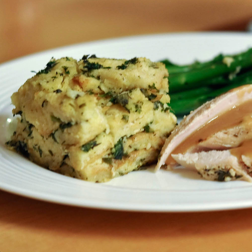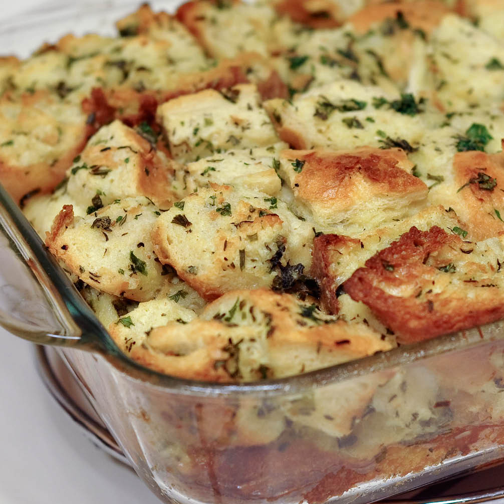 A couple months back my family and I went to Disneyland for a few days. During our stay at the Hilton we ended up ordering room service for dinner because we were just too pooped from all the fun to actually go out. One of those nights I ordered roasted chicken, which came with a savory bread pudding. The bread pudding was phenomenal! So phenomenal, that I ordered the same dish a second time during our visit. Yes, it was that good! The bread pudding was flavor packed and went perfectly with the chicken. This last weekend I tried to replicate the recipe to go with my roasted turkey because I didn’t want to do the same old stuffing I had just had a couple of weeks prior at Thanksgiving. I think it turned out fantastic! One thing I love about this recipe is that it is super easy, can be made in advance, and goes with any type of meat! This Christmas I will be making this bread pudding along with my prime rib. Whether you are cooking a ham, turkey, or a fine cut of beef at Christmas this will be the perfect side dish that will have everyone talking. It is a perfect substitute for those plain dinner rolls or even mashed potatoes.