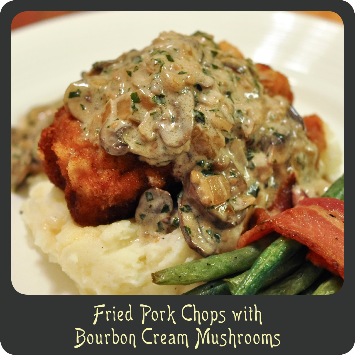 By now I probably have you convinced that the only meat we eat in our house is chicken. I swear it’s not! We really do eat a diverse selection of meat. I just find that those are some of my more creative recipes that are fun to share. Well I’m breaking the chicken trend and sharing a fabulous pork recipe. This is a super decadent way to enjoy a very simple cut of meat. The creamy mushrooms are rich and completely addictive. I thought they went wonderfully with some mashed potatoes. This is one of those recipes that completely knocked my hubby’s socks off. One of those meals where there is minimal dinner conversation because you are just taking bite after bite, and moaning every few minutes because you are full but you just can’t stop eating. If you are looking for one of those kinds of dinners, this is it.