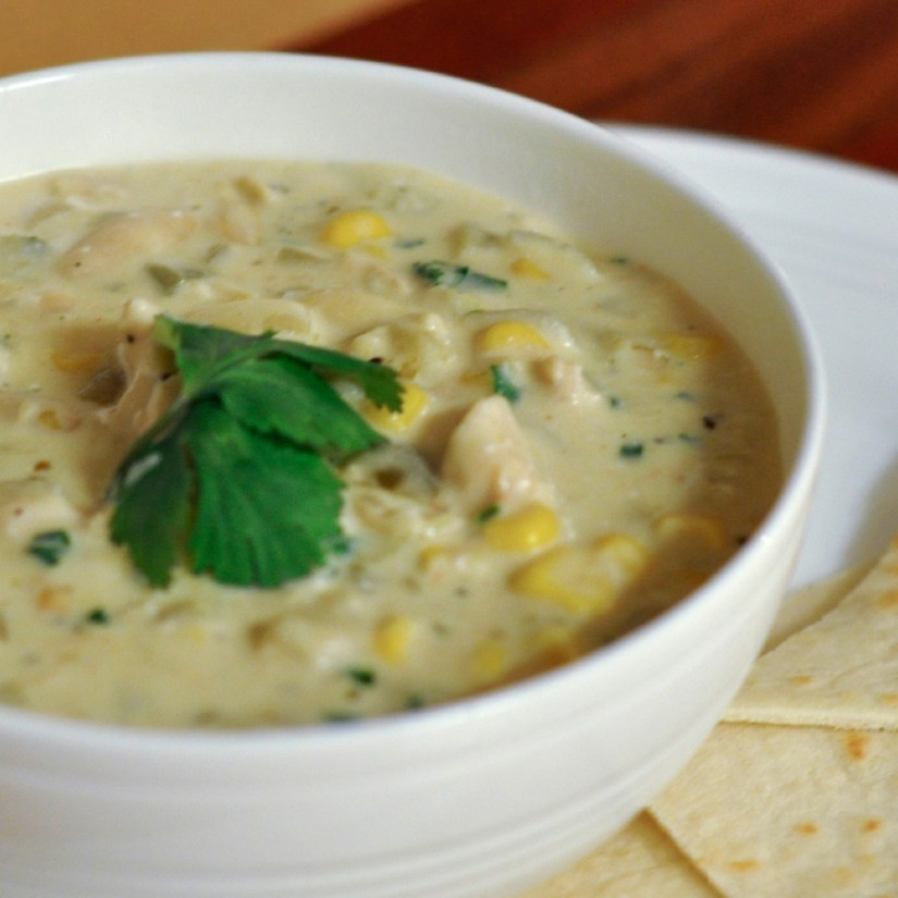Chili is one of my favorite comfort foods and I love that this is a fun twist on the classic bean based dish, and the fact that it is super easy is a huge plus too. I took several different recipes I found online and mixed them all together and came up with this one for creamy white chicken chili. I think it turned out pretty darn fabulous! I used green chilies keeping it really mild so that everyone in the family would eat it but you can substitute jalapeños to give it a good kick. The mild heat is really balanced out nicely with the creaminess of the cheese and the sweetness of the corn. I served it up with some cut up tortillas on the side but a quesadilla would be great too. If you have any chili cook offs coming up give this recipe a shot. You may just get some extra points for thinking outside the box.