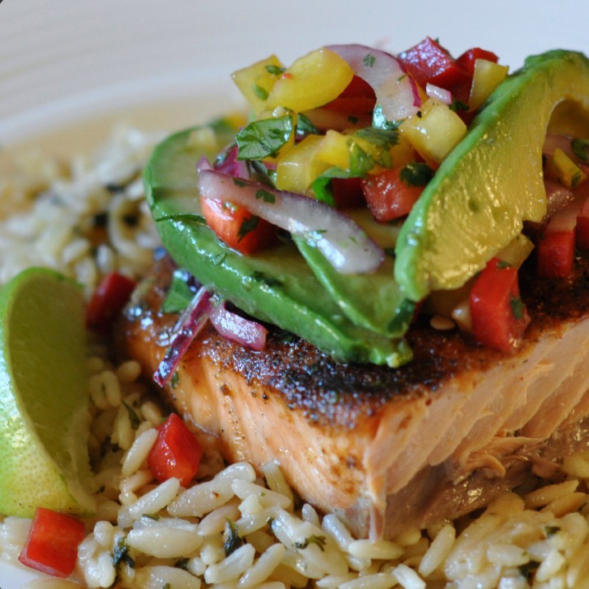 The 110º day in Sacramento a couple of weeks ago was a brutal reminder that the summer heat is in full swing! During the hot days I avoid using the oven whenever I can. I’d much rather send the hubby outside to operate the grill allowing me to enjoy a lazy evening. This is a quick and easy, flavor packed, and super refreshing salmon recipe, perfect for these warm summer nights. The salmon is seasoned with some of my favorite Mexican spices giving it a nice little oomph and the avocado salsa is cool and refreshing making this a perfectly balanced dish. It is light in calories and carbs, perfect for anyone looking for a great tasting and healthy meal.