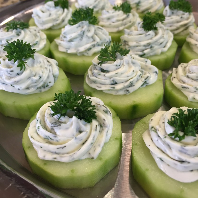 - Pipe the herbed cream cheese mixture onto each cucumber round.
